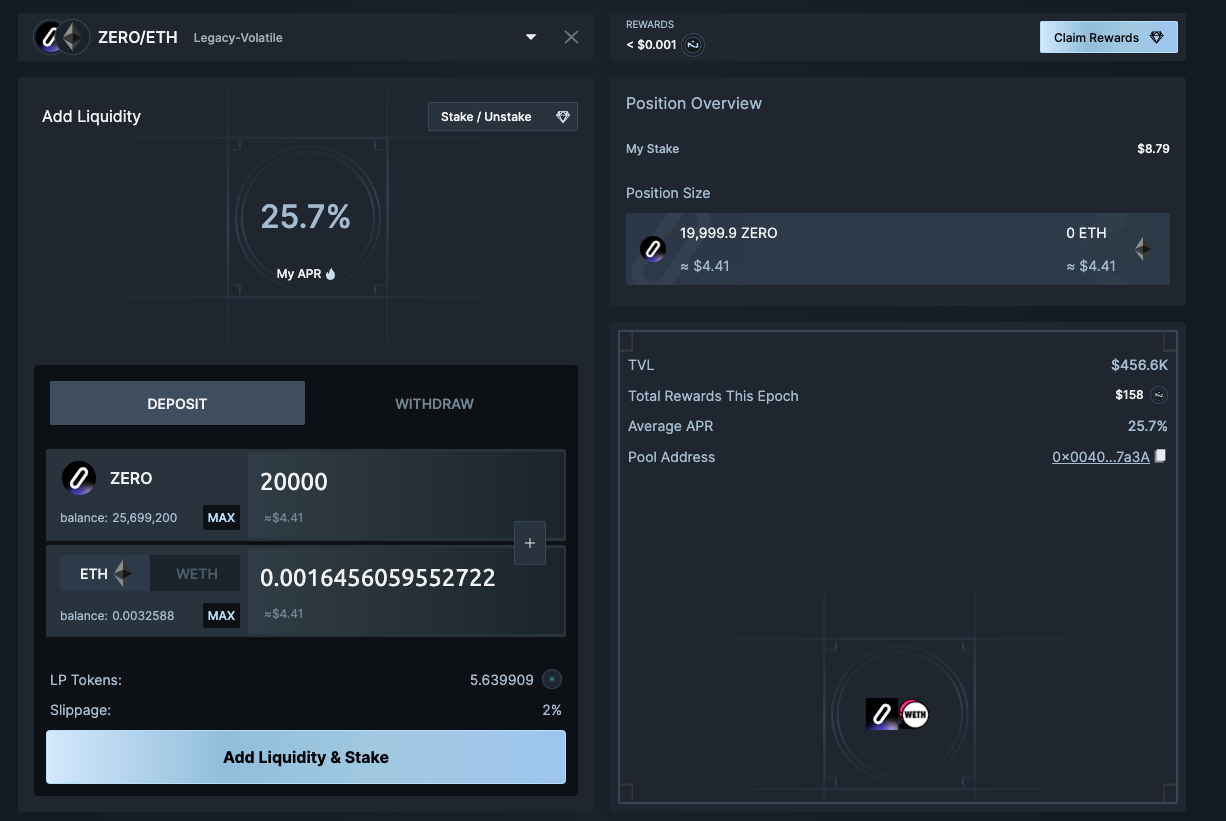 * For example, if you Zap and stake 0.1 ETH (\~$380 USD), it splits into $180 USD of ZERO and $180 of ETH. These amounts are added to liquidity on the DEX (Nile), and the LP tokens are staked and converted into voting power.